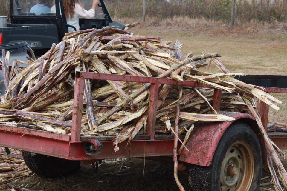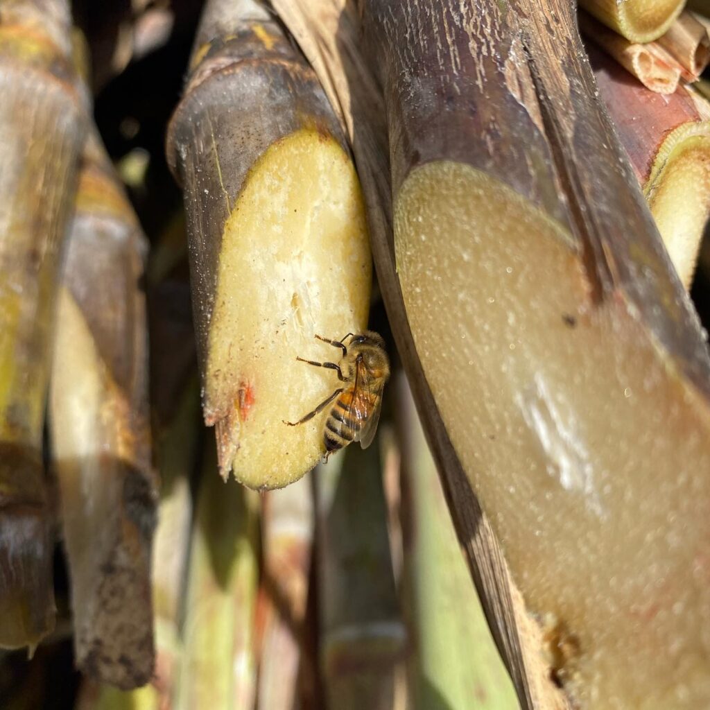Cut sugar cane and a very happy bee in Coverdale, GA. Photo by Sarah Mastrario Cook. (November 26, 2021)