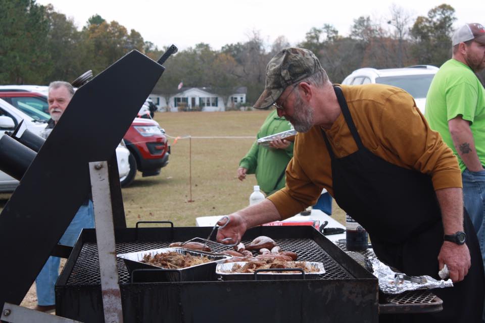 Family member Robert Greer, husband to Ellen Cook Greer, cooks some BBQ chicken on the grill for those who came to participate and watch the syrup cooking. Photo by Chris Cook. (November 25, 2017)