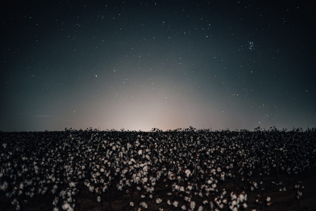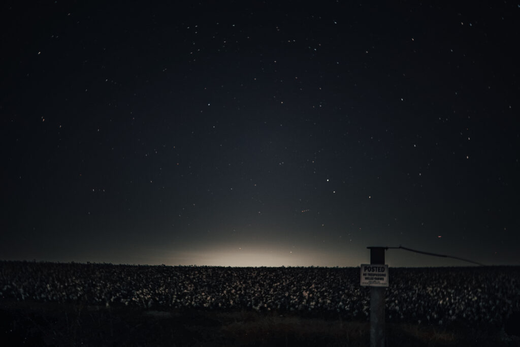This was our attempt to catch the northern lights on a forecasted night, but no luck this time. Still, the stars showed up, and the glow from nearby town glow made for a pretty interesting backdrop. The cotton fields didn’t hurt either.