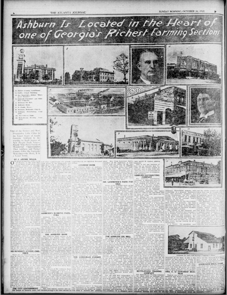 Ashburn 1918 Description February 15, 2026Ashburn 100 years ago, Ashburn was “one of the busiest and most progressive little cities in the Great Heart of South Georgia…” As seen in The Atlanta Journal (October 20, 1918 edition). To see the rest, click over to the archival record!