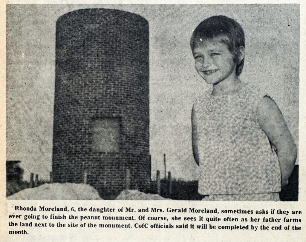 The original monument was actually built and completed in 1974. Newspaper coverage from the Macon Telegraph, The Wiregrass Farmer, and The Florida Times-Union throughout 1974 documents its construction and completion. The February 19, 1975 date shown on the plaque at the base of the peanut appears to reflect the formal dedication ceremony, not the year it was constructed. It is a small detail, but an important one in telling Ashburn’s story accurately.