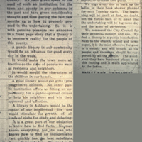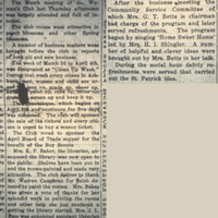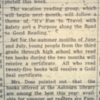 "Mrs. K.P. Baker, the librarian, announced the library was now open to the public. Shelves have been put in and the rooms painted and made very attractive... Mrs. J.L. Bass was appointed assistant librarian."