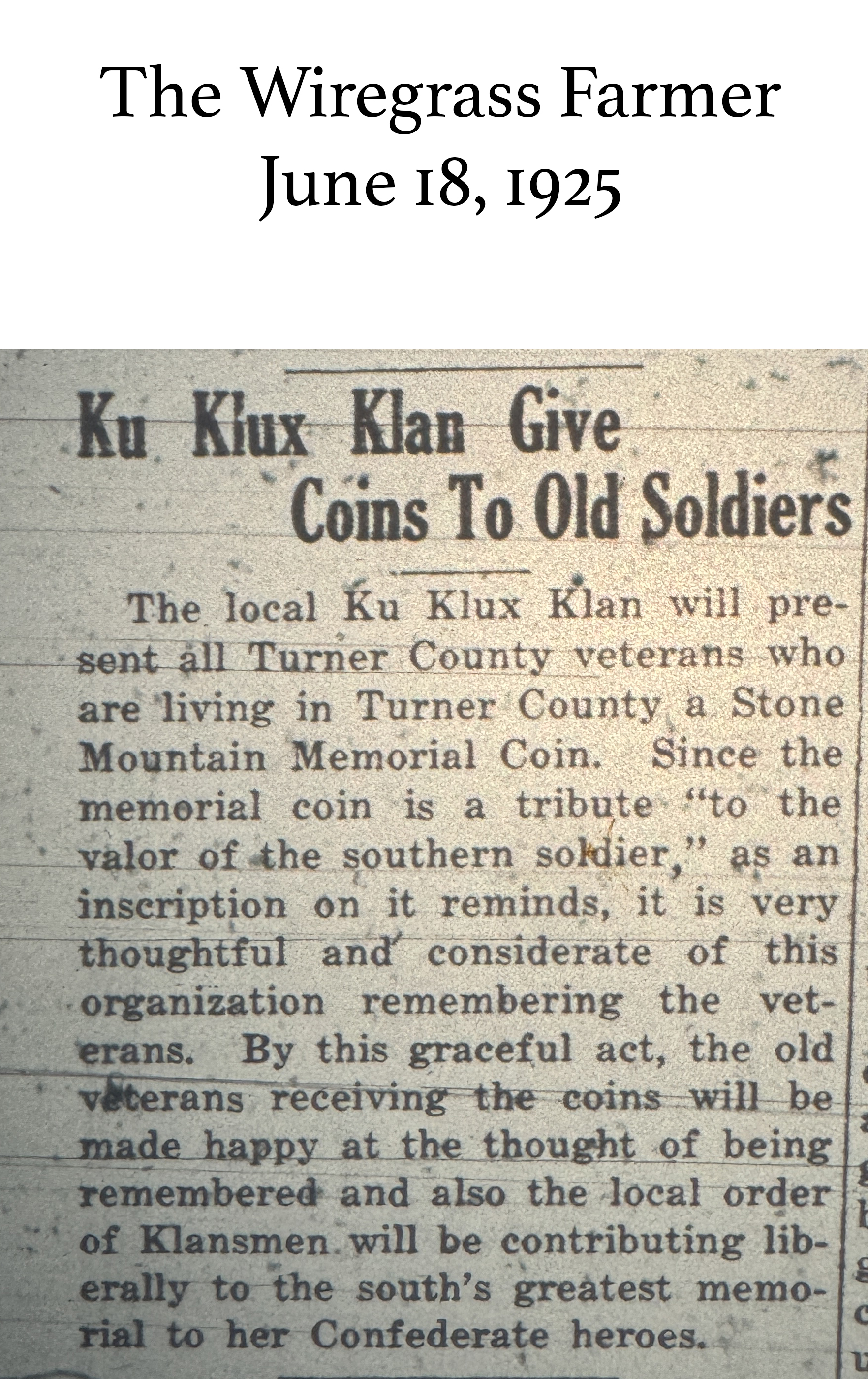 “Ku Klux Klan Give Coins to Old Soldiers,” Turner County Project Digital Archive Repository, accessed October 9, 2025, https://turnercountyproject.com/archive/items/show/1107.