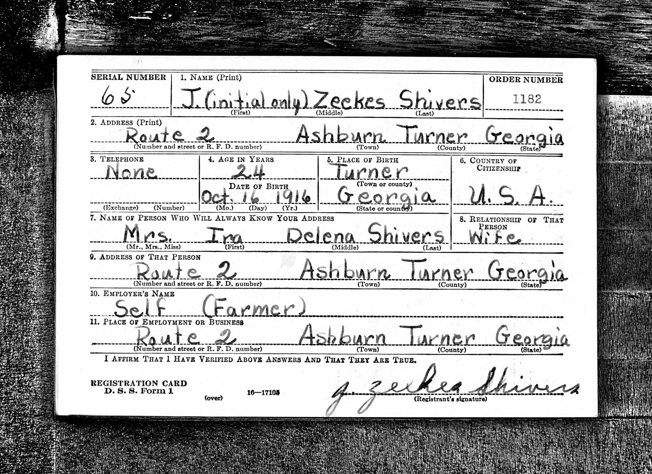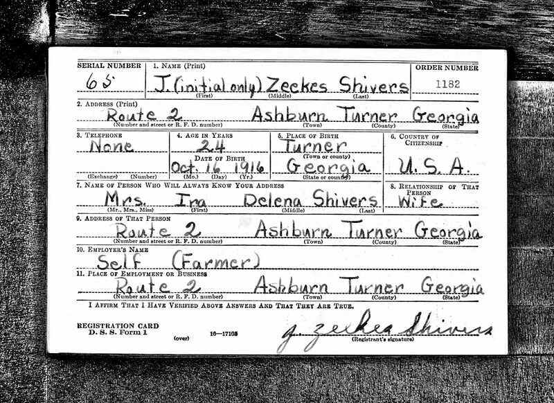 “J. Zeekes Shivers WW2 Draft Card,” Turner County Project Digital Archive Repository, accessed March 7, 2026, https://turnercountyproject.com/archive/items/show/1185.