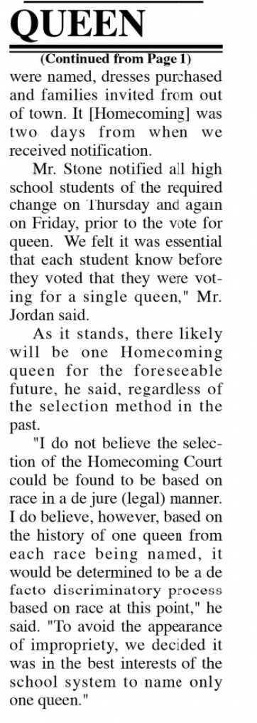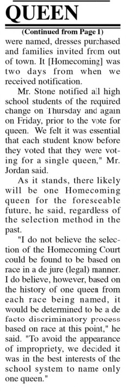 Then-Superintendent Ray Jordan explained the decision plainly: “To avoid the appearance of impropriety, we decided it was in the best interests of the school system to name only one queen.”