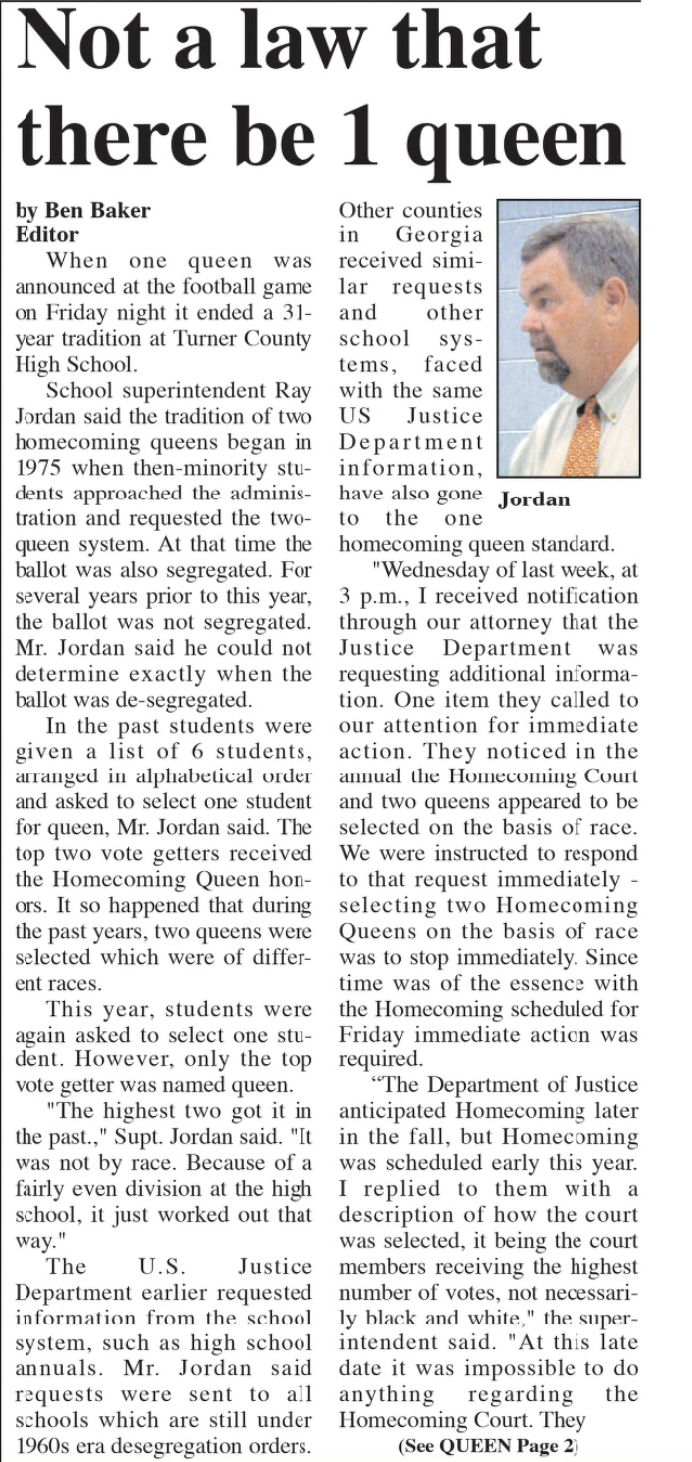 In 2005, Turner County selected a single Homecoming Queen for the first time in three decades, ending a “tradition” that had been in place since 1975. According to The Wiregrass Farmer, the two-queen system began when minority students approached school administrators requesting the change; at that time, the Homecoming ballot itself was still segregated. While the ballot was later integrated, the exact year of that change remains unknown.