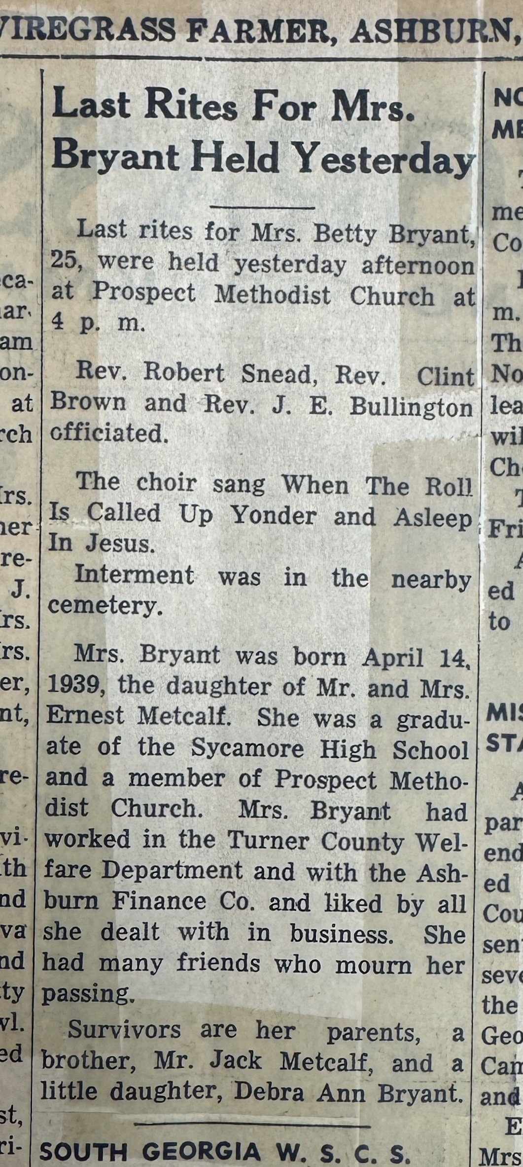 “Last Rites for Mrs. Bryant Held Yesterday,” Turner County Project Digital Archive Repository, accessed April 23, 2026, https://turnercountyproject.com/archive/items/show/1256.