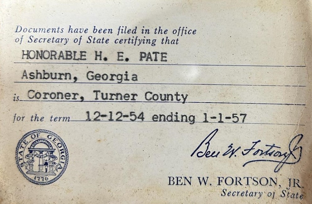 This is a card from the GA Secretary of State showing the term of H.E. Pate as Coroner of Turner County from 12/12/54-1/1/57.