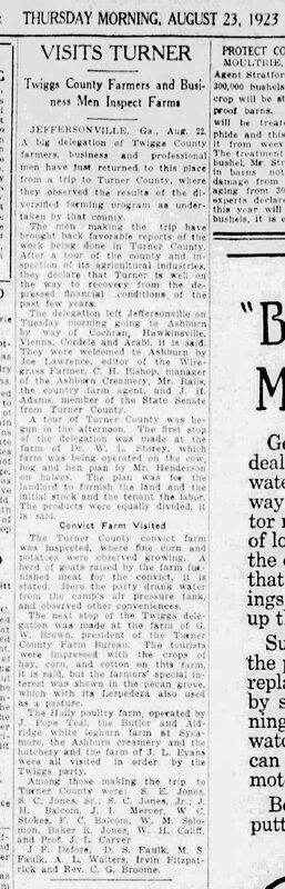 "The Turner County convict farm was inspected, where fine corn and potatoes were observed growing. A herd of goats raised by the farm furnish meat for the convict, it is stated. Here the party drank water from the camp's air pressure tank, and observed other conveniences."